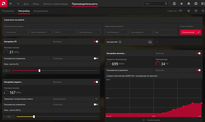 Вторым подменю во вкладке «Производительность» идет «Настройка». Здесь можно отрегулировать тактовые частоты графического процессора и памяти. Это можно сделать как вручную, так и отдать на откуп автоматике с помощью вшитых предустановок, кнопки которых находятся сверху. Помимо разгона, можно и «остудить» пыл видеокарты с помощью понижения частот и лимита энергопотребления. Также можно создать собственную кривую для управления вентилятором видеокарты в зависимости от температуры графического процессора.