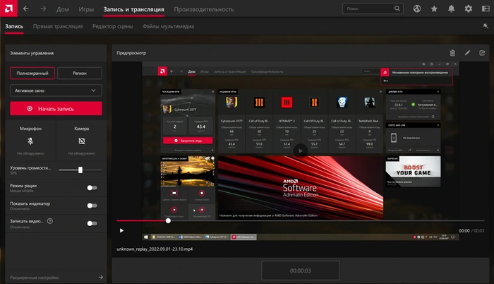 Графическая оболочка драйвера AMD обладает функциями записи экранного видео и ведения прямой трансляции. Для начала работы с ними нужно перейти во вкладку «Запись и трансляция», которая в свою очередь начинается с вкладки «Запись». Здесь находятся опции выбора области записи, задействования веб-камеры и микрофона, а также непосредственно сама кнопка начала записи экрана. В окне справа можно быстро проиграть последний записанный ролик.