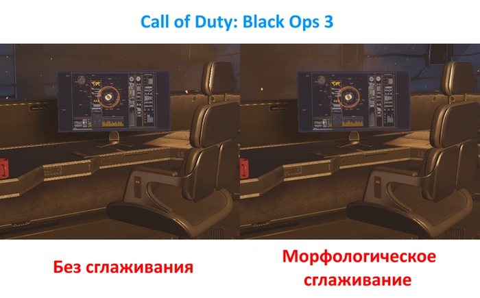 Настройка «Морфологическое сглаживание» позволяет принудительно задействовать быстрое сглаживание на основе постобработки. При нехватке производительности для других видов сглаживания такой вариант является неплохим компромиссом, так как практически не влияет на количество кадров в секунду. Побочным эффектом его применения является небольшая размытость изображения.