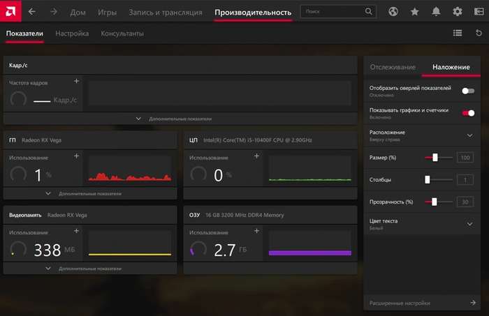 Помимо расширенных настроек графики, в AMD Radeon Software Adrenalin Edition присутствует встроенный мониторинг и оверлей для вывода его показателей непосредственно в интерфейсе игр. Для включения оверлея нужно перейти на вкладку «Производительность», после чего вы окажетесь в меню «Показатели». Внутри него в режиме реального времени мониторится нагрузка на «железо», тактовые частоты и прочие аппаратные показатели. С правой стороны находятся две дополнительные вкладки настроек — «Отслеживание» и «Наложение». В первой можно выбрать нужные показатели оверлея, во второй — активировать его и настроить внешний вид на свой вкус.