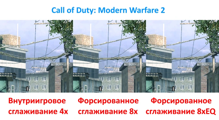 Следующая строчка «Метод сглаживания» позволяет выбрать между множественной (MSAA) и избыточной выборкой (SSAA), а также их адаптивной комбинацией (AAA). MSAA обеспечивает высокую производительность, но имеет недостатки — отсутствие сглаживания прозрачных текстур и мерцание объектов при движении. SSAA является самым качественным методом сглаживания, но очень сильно влияет на производительность. AAA объединяет оба типа сглаживания, представляя более качественную картинку, чем MSAA, при небольшом ухудшении производительности относительно последней.