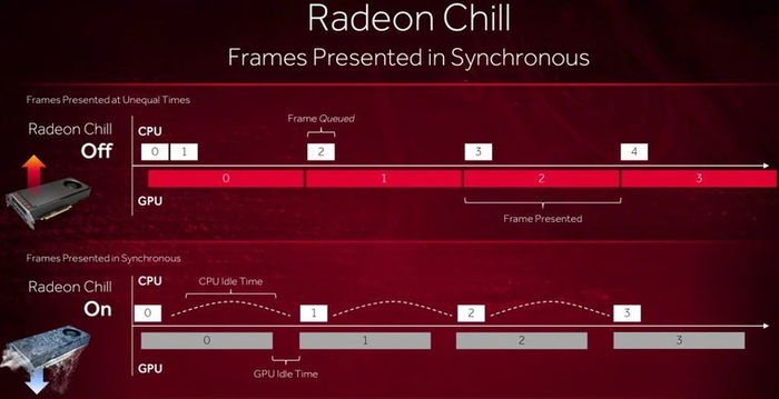 Radeon Chill призвана ограничить максимальную частоту кадров для экономии энергии. У настройки имеется две опции для раздельной регулировки частоты при низкой и высокой активности в игре: при первой она понижается, при второй — повышается. Диапазон обеих варьируется от 30 до 300 кадров в секунду, при этом первая опция иметь значение выше второй не может. За счет ограничения частота кадров становится более ровной, а также снижается энергопотребление графического процессора.
