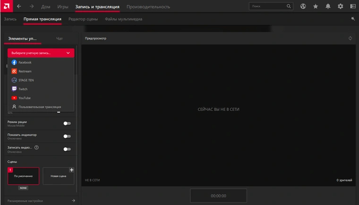 В следующей вкладке «Прямая трансляция» предлагаются аналогичные инструменты для ведения прямой трансляции на стриминговых площадках. Чтобы начать ее, необходимо выбрать из выпадающего списка тип учетной записи и ввести свои данные.