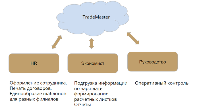 Так как важным поставщиком информации для управленческого учета является отдел кадров, то нужно его включить в единое “облако” в которой вести управленческий учет для целей расчета с курьерами и формирования отчетов по результатам деятельности компании.
