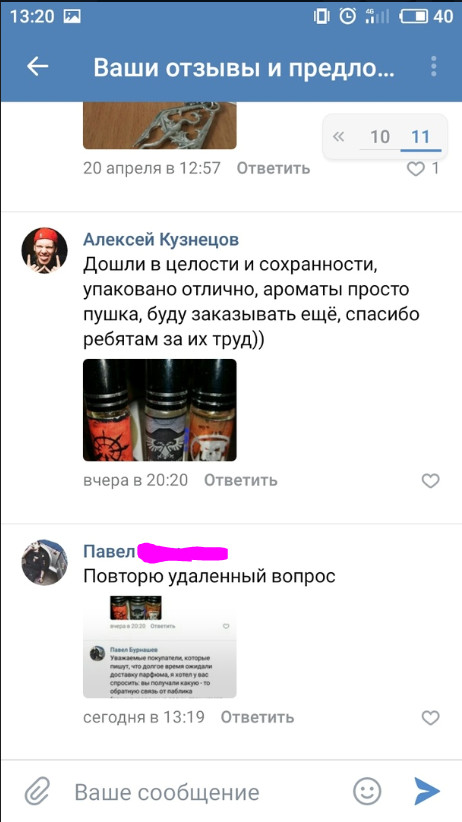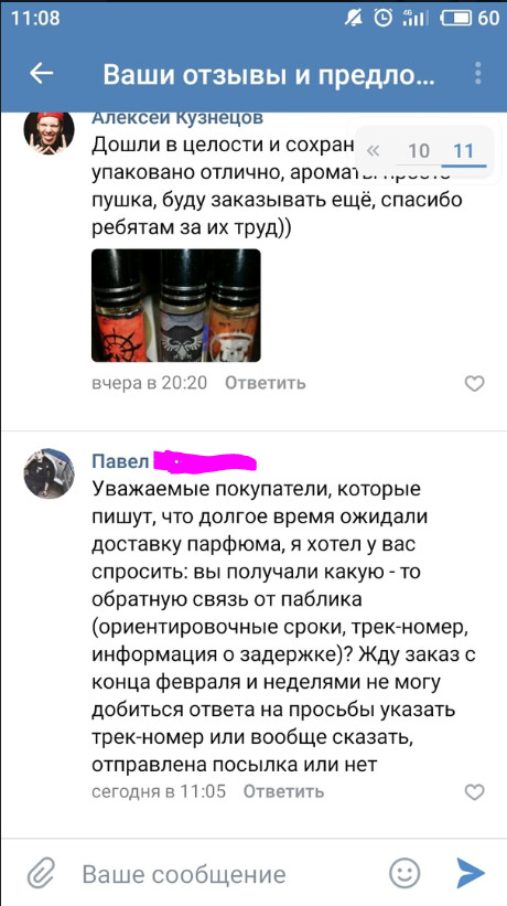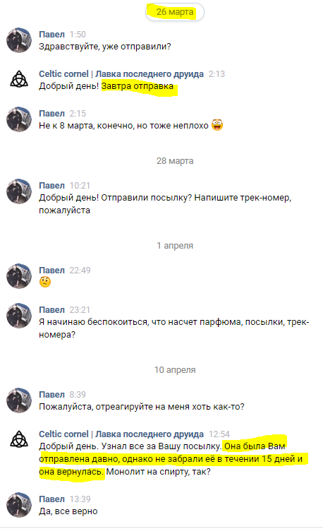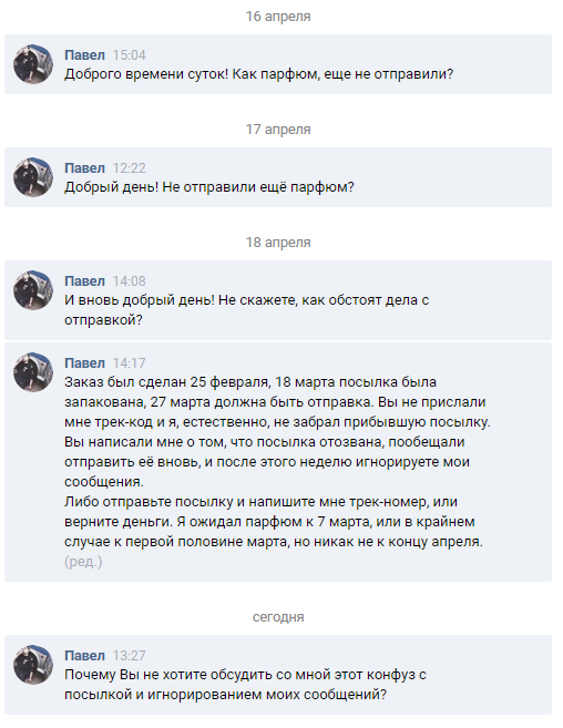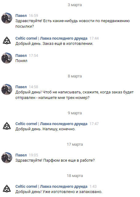 После этого началась череда мистических ответов на мои вопросы о готовности парфюма, его отправке, трек-номере, которые я до сих пор никак не могу объяснить. Судя от отзывам, оставленным в паблике, ни у кого подобных необоснованных заминок не возникало, и админ с завидной регулярностью и скоростью отвечал на все вопросы:
