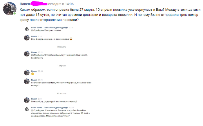 В следующем скрине переписки особенно проявляется вся таинственность друидизма. По словам друида, посылка была отправлена 27.03.2019, затем - череда игнорирования вплоть до 10 апреля. 10 апреля узнаётся, что посылка была отправлена давно, и я, как безалаберный получатель без трек-номера, не забрал посылку и она вернулась через 15 дней. Однако, нехитрым подсчётом удалось выявить, что между 27 марта и 10 апреля не 15, а 14 дней, и это даже не включая количество дней доставки и количество дней возврата.