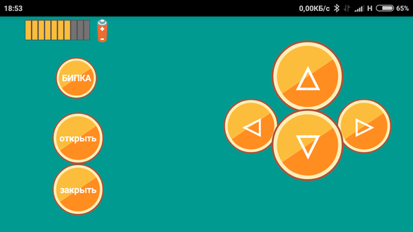 Используемая мобилка Xiaomi redmi 3 pro с установленной программой Remote XY (не реклама). На экране отображается управление: вперёд - назад, влево - вправо; уровень заряда АКБ; Бипка - включает сигнал на зуммере. Кнопки открыть и закрыть для клешни, которую снял для доработки.