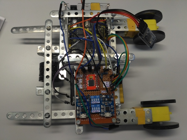 Драйвер двигателя и модули зарядки распаяны на одной плате для удобства, так же на плате выведены контакты для двигателей, батарей, питания +7,4 и +5, вывод измерения напряжения на батареях, входа управления с ардуино.