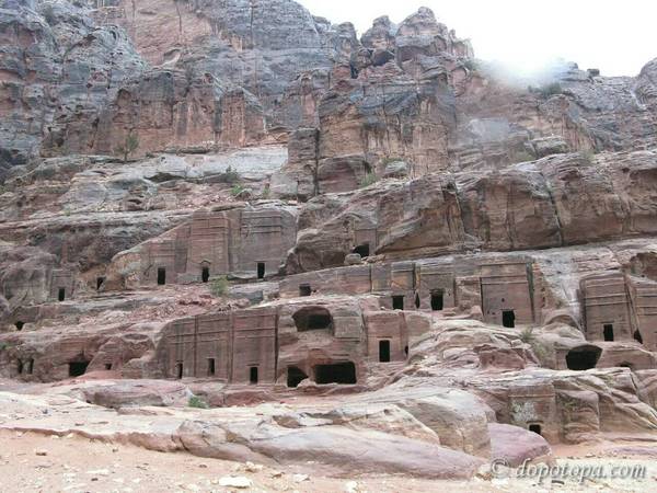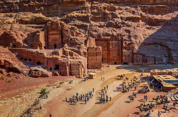 Каньон постепенно расширяется, и туристы попадают в естественный амфитеатр, в песчаниковых стенах которого множество пещер. Но главное, что бросается в глаза, — это выдолбленные в скалах склепы. Колоннада и амфитеатр свидетельствуют о присутствии римлян в городе в первом и втором веках.Бедуины предлагают уставшим туристам проехаться на верблюде, продают сувениры и поят свои стада коз у городских источников, воды которых утоляют жажду людей и животных.