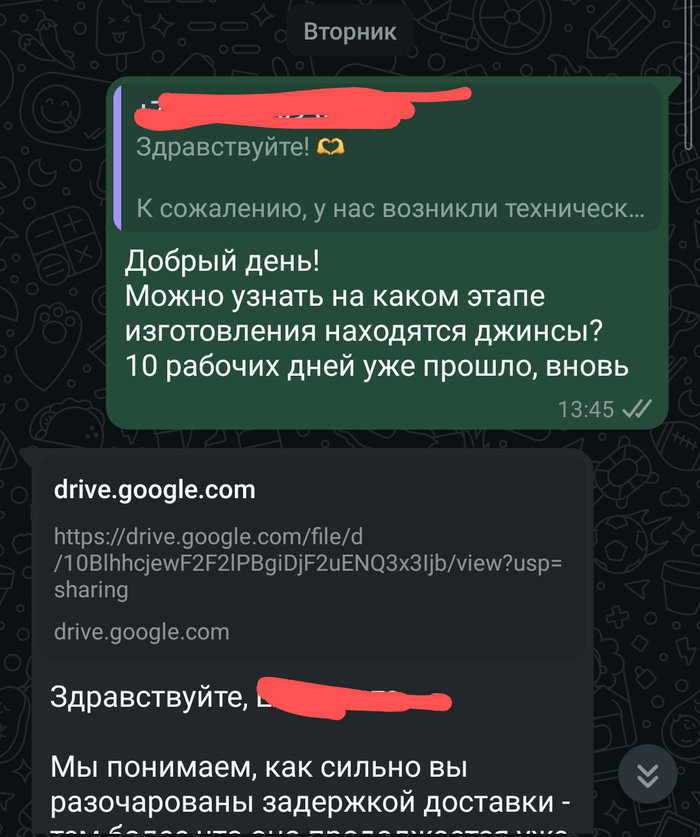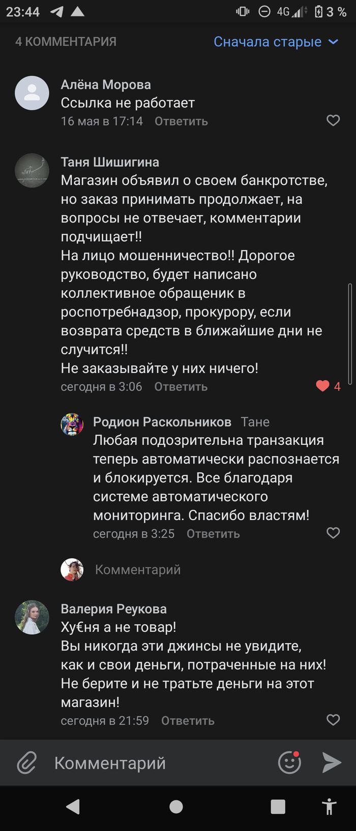 На дворе конец апреля. Ни ответа, ни привета. Решила поинтересоваться, как же дела с моими джинсами. В ответ у нас проблемы, войдите в положение.