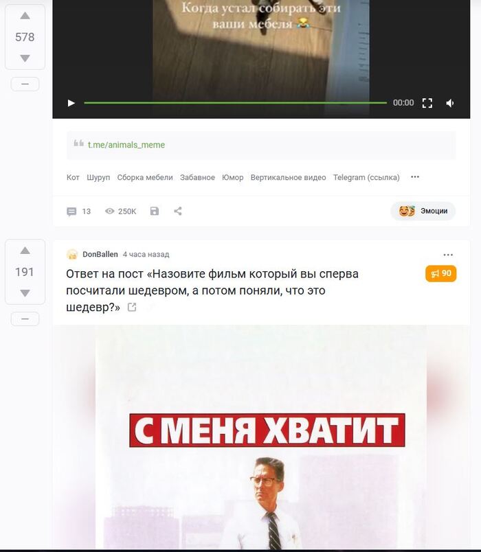 Сижу смотрю ленту постов на Пикабу, попадается пост с видео про котика, который лежит на полу рядом с деталями мебели, в озвучке идет перевод с названием фильма "С меня хватит!". И следующим же постом идет "Ответ на пост «Назовите фильм который вы сперва посчитали шедевром, а потом поняли, что это шедевр?»" именно с этим фильмом "С меня хватит!"