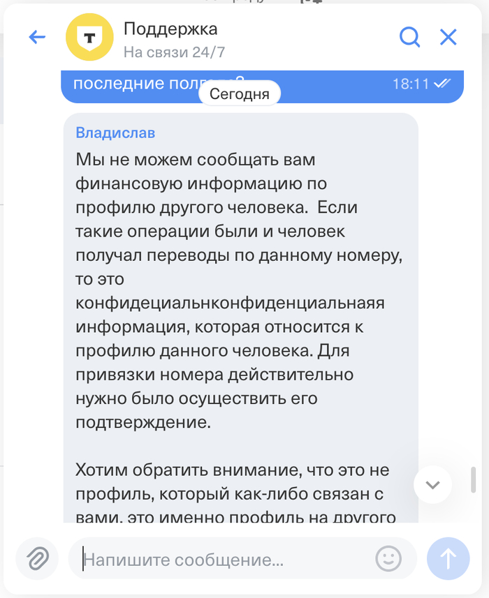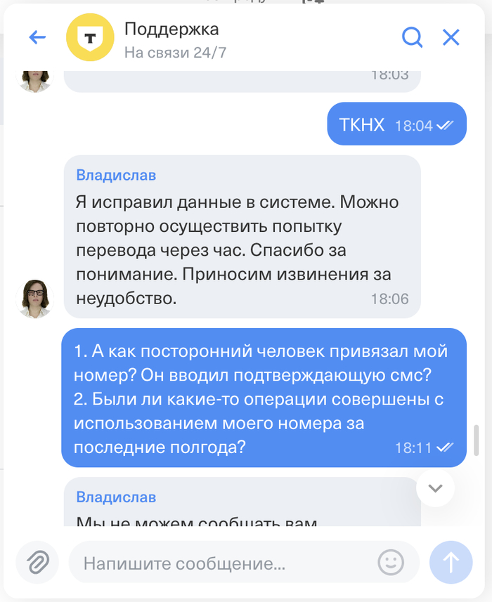 Итого: номер мой, банк это проверил-признал, но если по моему номеру были переводы и они ушли "в профиль другого человека", то это меня не касается. Как произошла такая "ошибка" тоже не ясно - где-то есть дубликат моей симки или в самом Т-Банке "ошибка". Если бы того человека так же завали Дмитрий и фамилия начиналась бы на ту же букву, что у меня, то улетели бы деньги ему и хорошо, если бы я проверил счет (вряд ли).