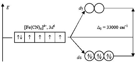 Черные точки на рисунке это отрицательные заряды, поэтому электрону будет выгоднее быть на орбитали, которая дальше от этих орбиталей. На рисунке сверху, третья орбиталь выгоднее чем первые две. Поэтому происходит расщепление уровней энергии. При этом разные ионы и молекулы в окружении вызывают различное расщепление, например хлорид ион вызовет меньшее расщепление чем вода, а аммиак большее чем вода.