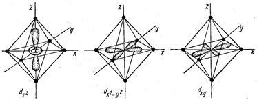 Если взять d орбитали и поместить их в поле с симметрией отличной от сферической, то некоторые орбитали станут менее выгодны по энергии, а некоторые более. Рассмотрим на простом примере с октаэдрическим окружением иона металла.