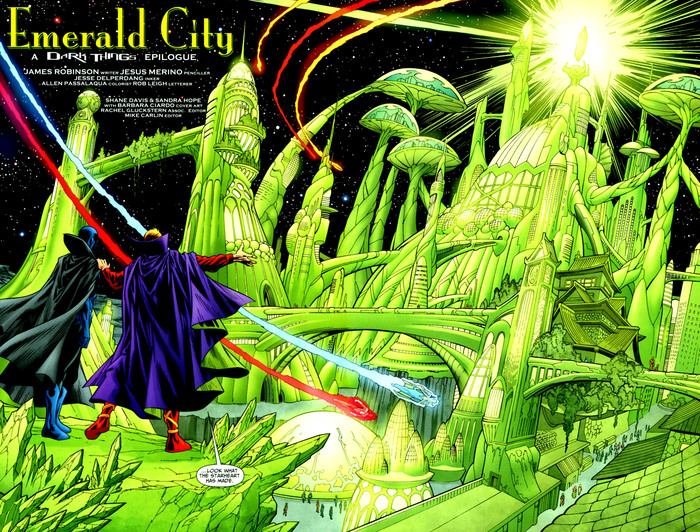 Своей силой Алан соорудил на тёмной стороне Луны настоящий Изумрудный Город – город, каждое здание в котором полностью состоит из изумрудной энергии Звёздного Сердца, из силы воли и энергии Алана Скотта. Этот город стал убежищем для всех сказочных народов Земли, от фей до троллей. Поживи в таком городе недельку - и весь остальной мир будет казаться красным.