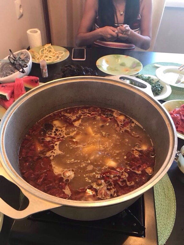 В этот момент суп стал закипать и мы принялись его пробовать. Суп по китайской традиции надо есть из общей кастрюли, которая варится прямо на кухонном столе на газовой переносной плитке. В состав супа входит картошка, зелень, хитрые китайские приправы, которые Нана привезла с собой, древесные грибы муэр. Обычно китайские супы - жидкие. По этикету, твёрдые кусочки, плавающие в бульоне, едят палочками, а жидкость вычерпывают ложкой или выпивают. Каждый вокруг этой кастрюли варит сам себе мясо в специальных ситечках.