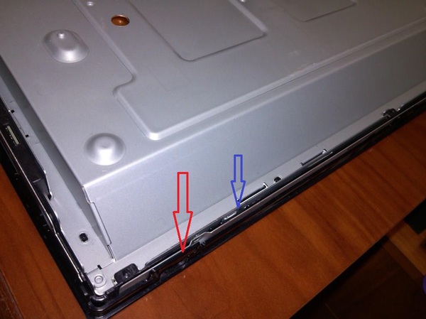 Обходим по периметру, выкручиваем винтики. Отжимаем аккуратно защелки, подставляя стопоры и снимаем крышку с приклеенными линейками светодиодов. Убираем ЖК пирог в сторону. Не забудьте отцепить шлейфы матрицы!