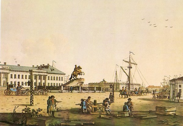 Камень этот не простой, молния как гнев небесный ударила в скалу и отколола этот кусок, который потом нашел один из казенных крестьян, который и откликнулся на царскую просьбу о поиске подходящего постамента. Для его транспортировки выбрали зимние месяцы, дабы промерзшая почва не вспахивалась и могла выдержать вес подобной глыбы. Дотолкав его до финского залива с особыми извращениями погрузили на корабль и доставили к Сенатской площади, где не менее извращенным способом с посадкой корабля на уготованные в воде сваи его выгрузили на нужное место, а там, откуда его увезли, образовался пруд, который в народе нарекли Петровским.
