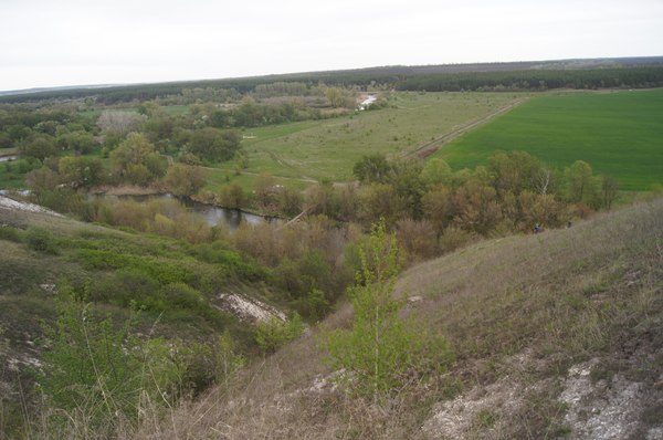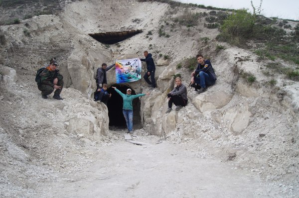 Но тем и лучше, не пришлось нам месить грязь. И по сухой дорожке мы легко подъехали к пещере. Многие кто был в пещере приезжают с другого берега р. Толучеевка, переходят по подвесному мосту и поднимаются по меловым порожкам вверх к пещере.
