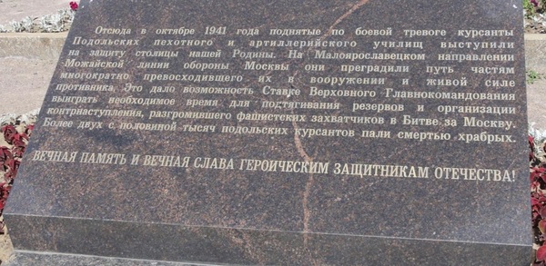 Почти 76 лет назад примерно 3,5 тысячи курсантов Подольских военных училищ вписали в нашу историю ещё одну героическую страницу. В октябре 1941 года они остановили части вермахта, которые рвались к Москве. Жуков выступил перед курсантами, сказав всего лишь несколько слов: «Дети, продержитесь хотя бы пять дней. Москва в смертельной опасности».