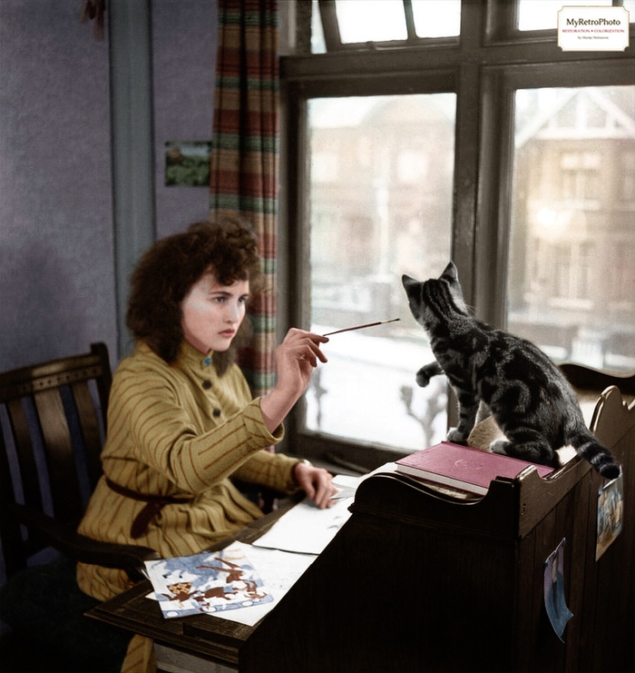 Иллюстратор Эрика Макдональд работает в студии со своим маленьким помощником. Лондон, Англия, 1947 год.