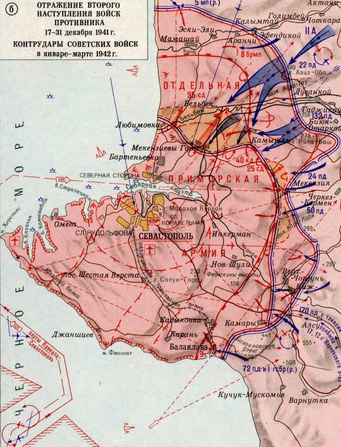 И вот, 17 декабря 1941 года части 11-й армии, подгоняемые сверху, идут на штурм 3 и 4 секторов обороны Севастополя с целью выйти к бухте и покончить со снабжением города-крепости, причем 24-я пехотная дивизия, которая должна была добиться решающего успеха и для поддержки которой была задействована основная часть артиллерии, практически сразу забуксовала, им удалось занять только несколько высот и все. Так же непроходим для нее стал рубеж из полка моряков под командованием Гусарова численностью чуть более тысячи штыков. Краснофлотцы оборудовали рубеж по краю кустарников, через которые для поражения огневых точек враг не мог бросить гранату, она цеплялась за ветки, и если наносила урон, то только врагу. А хорошие укрепления и связь позволяли вызывать огонь на себя и перекашивать наступающих фашистов. При этом вспомогательный удар 22 пд, наоборот, показывает неплохой результат, и немцы продвигаются к городу до 6 километров, а 8-я бригада морской пехоты под их натиском откатывается. Так же в окружении оказались части 95-й сд, которые в последствии просачивались к своим.