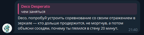 А во-вторых, добавил немного фана. Если написать боту "мне скучно", он не пытается это сохранить, а включает режим саркастичного помощника и выдает какую-нибудь дичь, чтобы поднять настроение. Вчера он предложил мне провести фотосессию для моего кактуса в стиле "нуар". Я на полном серьезе потратил на это 15 минут.
