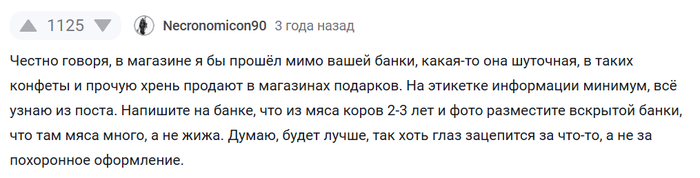 И так осень 2020 года, мы запустили первые продажи тушенки. К апрелю 2021 года - продажи в среднем 5тыс банок в месяц. Мы думаем тогда 20000 банок в месяц это наша мега цель.