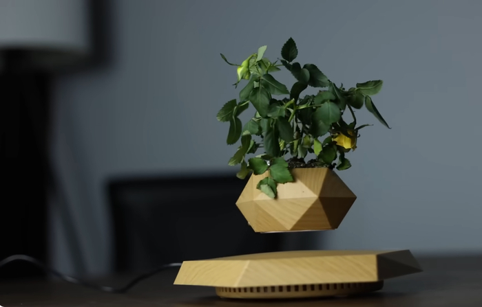 Этот аксессуар добавляет в интерьер немного магии. Горшок парит в воздухе благодаря системе магнитной левитации, медленно вращаясь вокруг своей оси. Эффект особенно красив с миниатюрными растениями, суккулентами или бонсай, которые в движении выглядят по-новому. Основание выполнено под дерево, а сам горшок — в минималистичном шестиугольном дизайне.