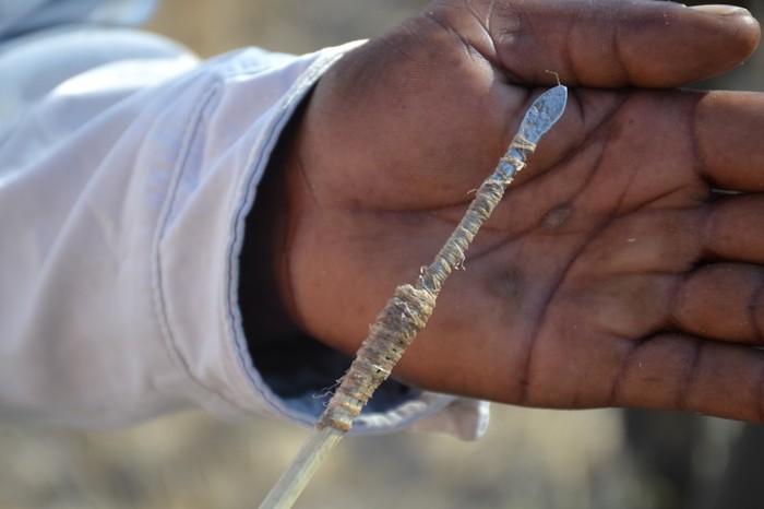 Хотел обменять свой походный 110-тый Бак на бушменский дротик, но глава семейства объяснил, что это единственный дротик в его семье и он не может мне его отдать. Тогда я подарил ему нож. Из нас двоих ему он нужнее.