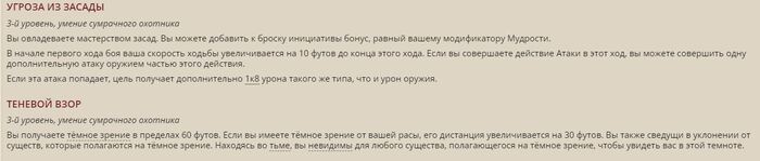 А теперь самое интересное, развитие в классах. Мы играли персонажами 8 уровня, у меня было 3 уровня Следопыта Сумеречного охотника и 5 уровней Монаха Кенсея. От следопыта мы получаем боевой стиль Сражение двумя оружиями, а также дополнительный урон каждый ход. Сам архетип даёт нам бонус к инициативе от мудрости (что сильно нам поможет), дополнительную атаку и урон, а также бустит нашу скорость в первом ходу. Более того, благодаря способности архетипа даже существа с тёмным зрением не видят нас в темноте, сами понимаете, как это нам помогает.
