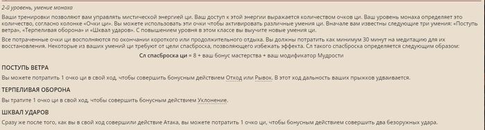 А теперь то, ради чего я всё это писал. В нашем ваншоте мы мастерски обошли все возможные боёвки, так что я так и не смог проверить билд на практике. Если сыграете, напишите, как работает. По этой причине всё что будет сказано дальше, всего лишь теория. Из-за высокого бонуса к инициативе вы будете ходить если не первым, то одним из первых. В первом ходу скорость будет 60 футов, что позволит быстро добежать практически до любого врага. Я планировал сразу бежать к лучникам/кастерам, и даже если после этого персонаж будет окружён, это в любом случае поломает строй противника, а мы потом сможем отбежать без апарты(если не отъедем,тут как повезёт). Помимо этого в первом ходу будет 5 атак. 1 атака(1д8), в него вкладываем Ошеломляющий удар, и при попадании наносим доп. урон со способности архетипа(1д8) + доп. атака с архетипа следопыта (1д8) + доп. урон от следопыта с Таши (1д4) + 2 атака (1д8) + тратим очко Ци и бонусным действием делаем две безоружные атаки (2д6). Если всем попасть, получится 4д8+2д6+1д4+мод. ловкости х5. Это, конечно, не 126 урона от Яхьи из Бесценного Опыта, но у нас и уровень меньше, и яда со Скрытой атакой нет. В последующих ходах, даже если закончится Ци, у нас будет минимум 3 атаки. Большая скорость и отсутствие апарты, если вы атаковали врага (попадать необязательно), в теории позволит быстро бегать по карте и приходить туда, где нужна помощь, но неизвестно, как это будет работать в игре, нужно проверять.