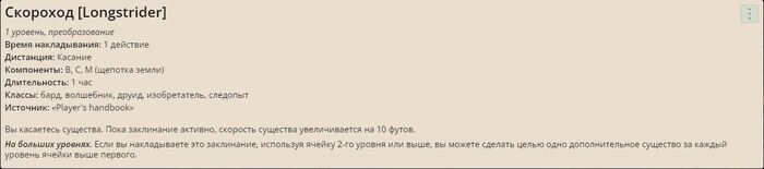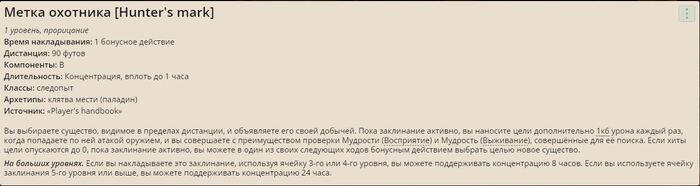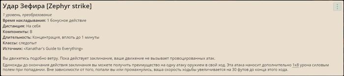 Касаемо заклинаний, тут всё просто. Поскольку я делал упор на ближний бой, я выбрал заклинания Метка охотника, Удар Зефира и Скороход. Скороход не является концентрацией, и из-за того, что действует час, его можно наложить до начала боя. С остальными заклинаниями сложнее, для обоих требуется концентрация, и тут придётся выбирать между доп. атакой и доп. уроном. По описанию, Метка охотника выглядит вкуснее, и в теории даст больше профита, чем атака от Удара Зефира, даже учитывая, что в последнем случае есть дополнительный урон. В любом случае, эти заклинания дают неплохой буст, так что не стесняйтесь пользоваться. В моём случае, если бы не удалось наложить заклинания до боя, я планировал ждать второго хода, так как очень хотелось ударить 5 раз, но в целом можно наложить и на первом ходу, по идее урона получится даже больше.