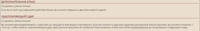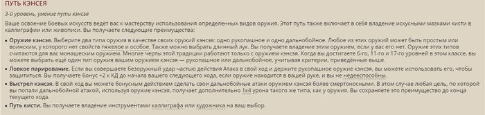 Не буду расписывать всё, что мы получаем от монаха, в данном случае нас интересует Шквал ударов на первом уровне, а также доп. атака и Ошеломляющий удар на 5. От архетипа нам нужна способность Путь Кенсея > Оружие Кенсея, которая позволяет нам сделать Длинный меч монашеским оружием и бить им от ловкости. Если вы любитель извращений, можете взять кирку или цеп, тоже по-своему интересно .