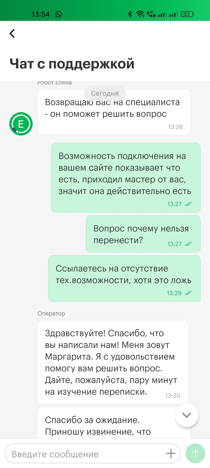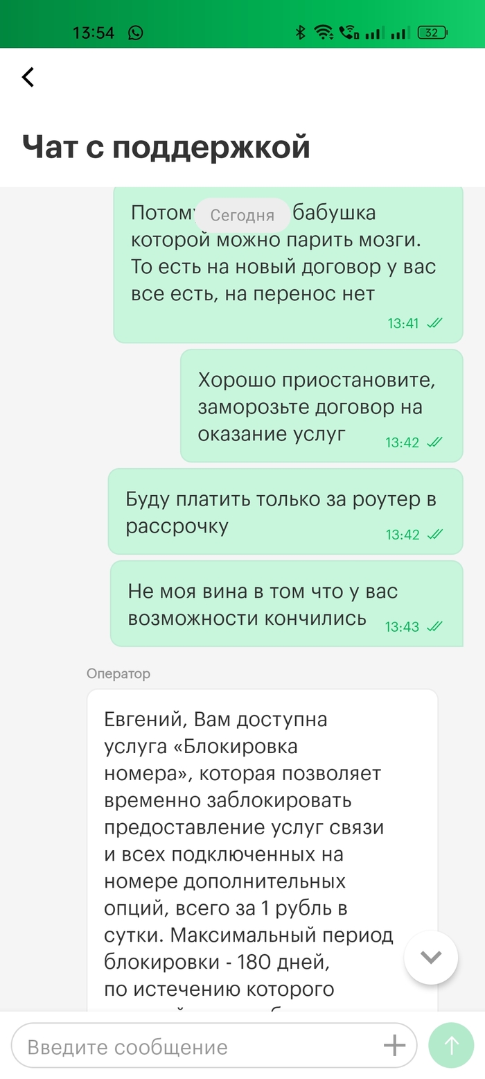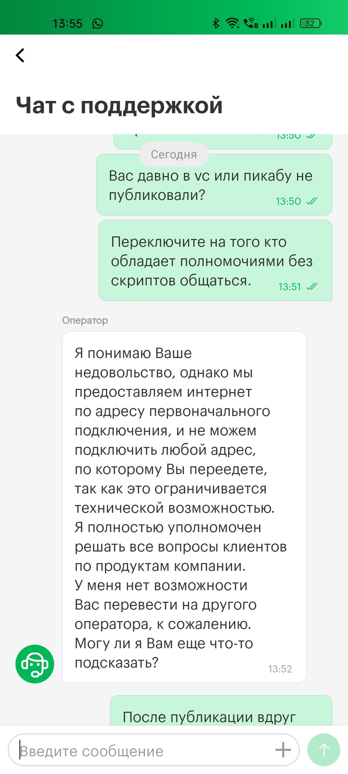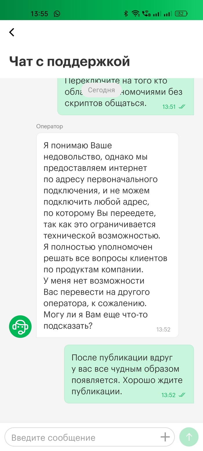 Итог: Мегафон вы реально людей за дебилов считаете?! Когда ваш оператор на услугу "переезд" оформляет заявку на новое подключение. Это говорит о не компетенции ваших сотрудников. Так же когда ваш оператор обещает перезвонить и не перезванивает в течении четырех дней( вы там заявки голубиной почтой отправляете?) И когда вы в итоге предлагаете решение проблемы с моими финансовыми потерями либо платой за воздух, либо выкупом роутера (хотя я больше чем уверен что это ваши бюрократические проблемы из-за этого вы не можете оказать мне услугу которую должны потому что кто-то где-то затупил и кривенькими ручками тыкнул не ту кнопку) Вы реально считаете людей далекими и не могущими сложить 2+2? Когда возможность на подключение есть, а на переезд нет. То это мне прям так и хочется послать вам как можно больше лучей добра и призвать хватит обманывать своих клиентов! Я все, выговорился.