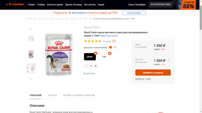 И видим, что за те же 24 пакетика корма тут просят всего 1260 рублей, без дополнительных условий и бонусов. Оказывается тут черная пятница работает как надо.