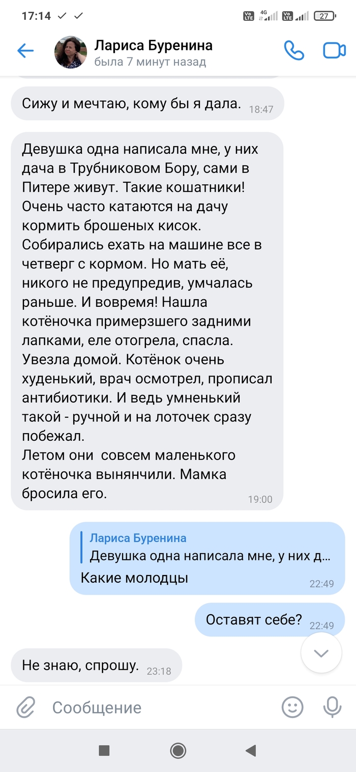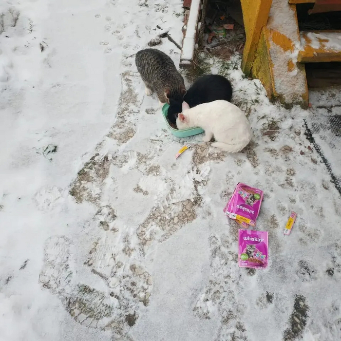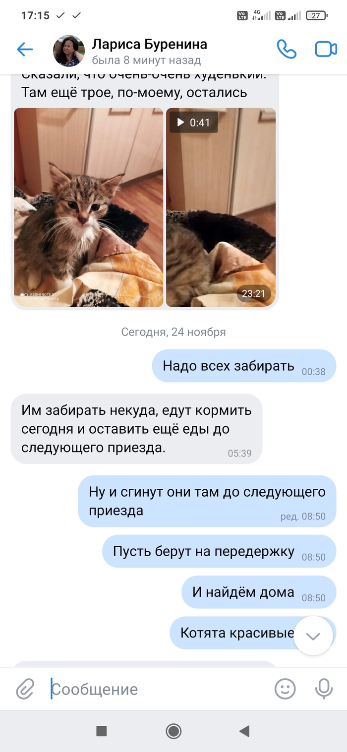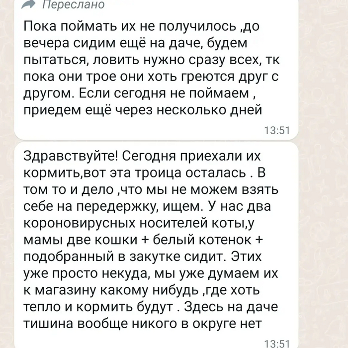 Всём привет. Люди несколько дней назад пасли со своей дачи котенка. Он вмерз в лед. Там осталось ещё трое. Сегодня владельцы участка поехали их кормить. До воскресенья не приедут. Котята очень худые.
