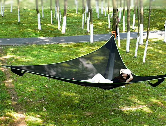 Прочный гамак с треугольной формой и тремя точками крепления. Выдерживает до 150 кг, изготовлен из нейлоновой сетчатой ткани. Устойчив к переворачиванию, в комплекте есть всё необходимое для установки.