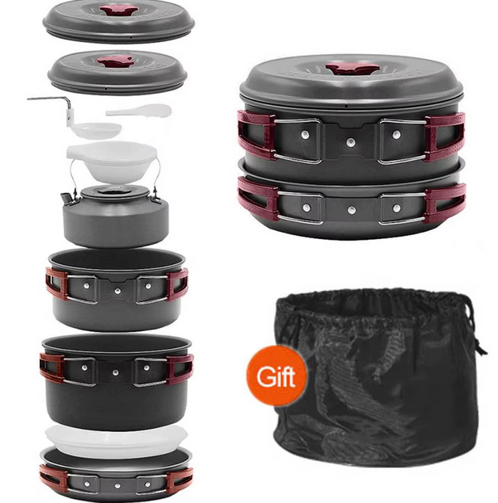 Состоит из кастрюль (2,5 л и 1 л), сковороды, чайника, мисок, тарелок и кухонных аксессуаров. Все элементы складываются друг в друга, образуя компактный комплект. Лёгкий и удобный в переноске, идеален для походов.