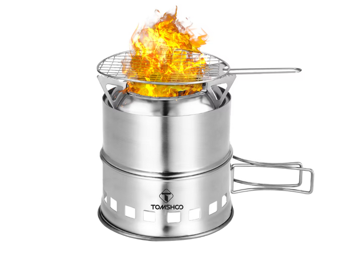 Складная печь с двойными стенками, ветровым экраном и отверстиями для воздуха. Работает на дровах или техническом спирте. Подходит для приготовления пищи и барбекю, в комплекте есть металлическая сетка и блюдце.