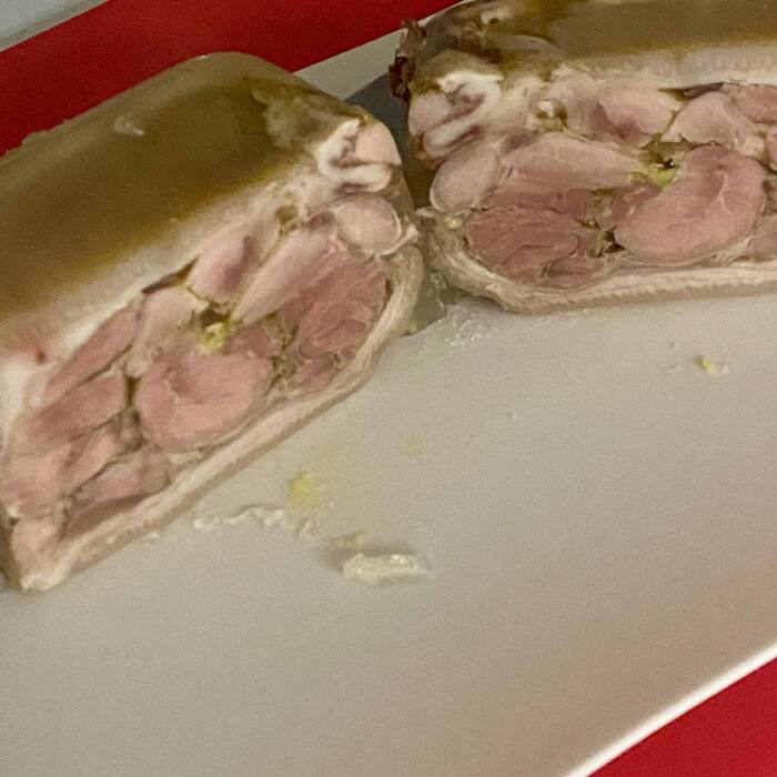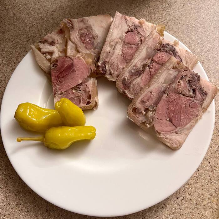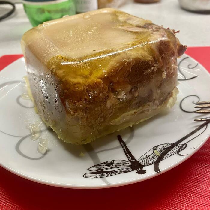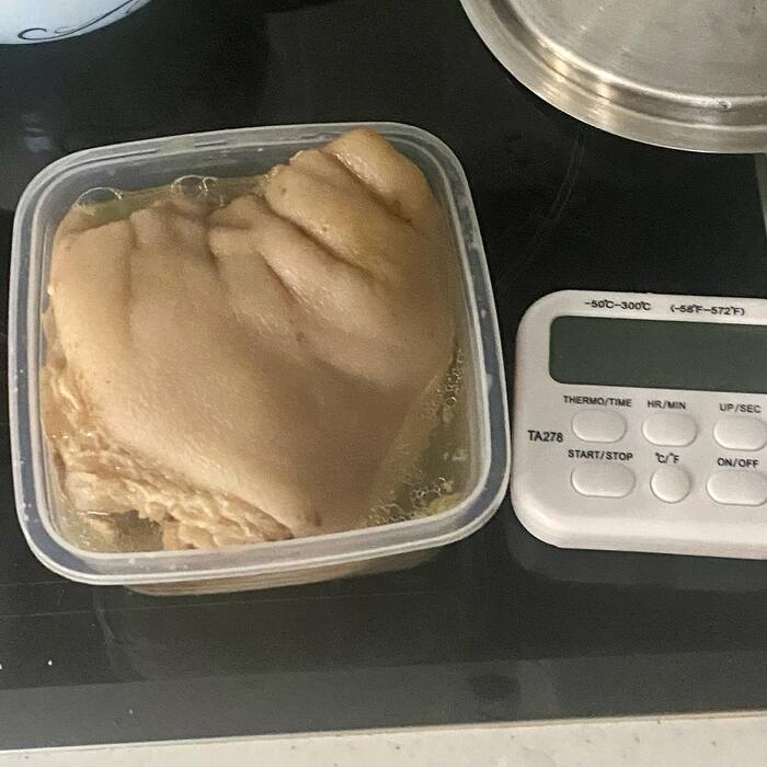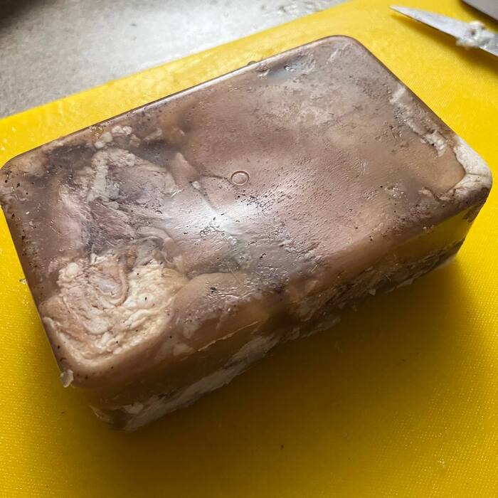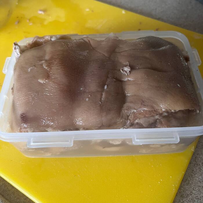 Укладываем подготовленное мясо в пищевой контейнер, подворачивая края для красивого узора. Если рулька одна, то подбираем контейнер подходящего размера и укладываем его туда свернутым в рулет.