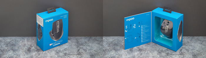 Поставляется Rapoo MT750S в относительной крупной сине-зеленой коробке с откидной крышкой. Внутри нее есть кокон-вкладыш их двух половин, между которыми находится устройство.