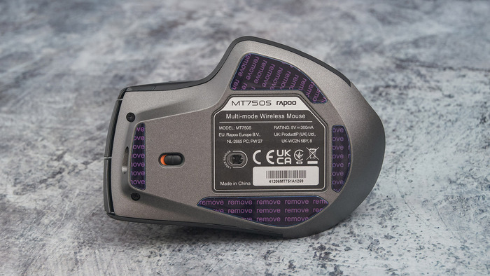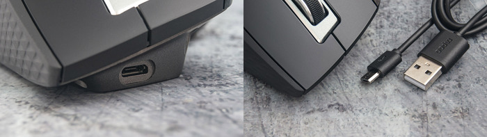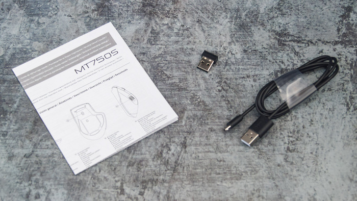 Передняя часть MT750S имеет разъем USB micro-B предназначенный для зарядки встроенного аккумулятора. В комплекте поставки есть соответствующий кабель. Сейчас, в 2024 году странно видеть устаревший разъем micro-B, а не современный USB type-C. Впрочем, насколько мне известно, модель MT750S уже далеко не новая и этот факт простителен, но не отменяет наличия отдельного кабеля для зарядки мыши.