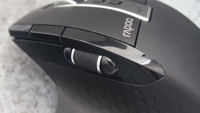 Для большого пальца у Rapoo MT750S припасена другая работа – второе колесо прокрутки. Оно очень широкое (15 мм), но при этом имеет малый диаметр. Также как и у основного колеса прокрутки, здесь есть резиновая шина (шириной 12 мм).