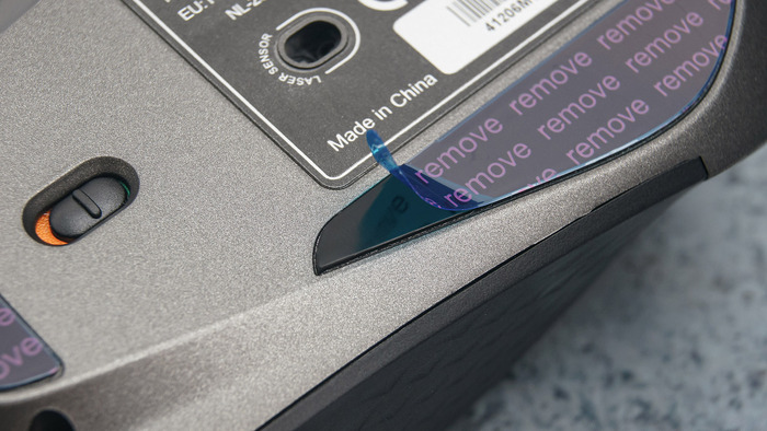 Нижняя часть выполнена единой деталью серого цвета, а значительную часть поверхности занимает информационный стикер.