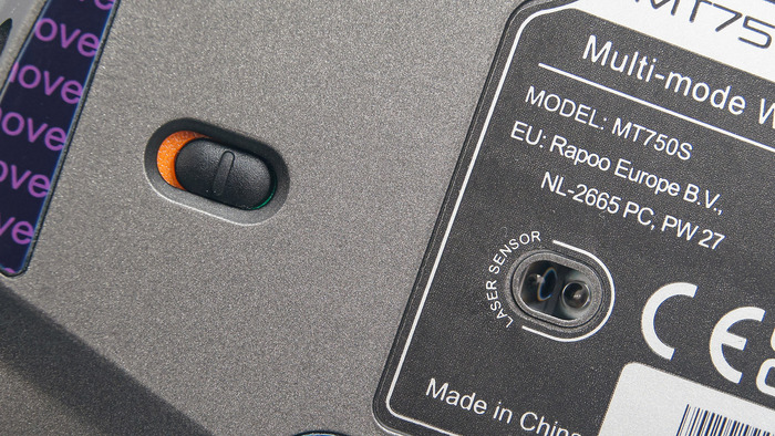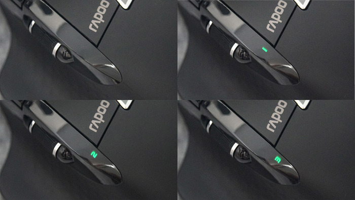 Rapoo MT750S можно подключить к четырем устройствам: к одному через USB-донг и еще к трем по Bluetooth. Переключение между устройствами производится кнопкой между основными клавишами. При переключении между устройствами индикатор цифрами сигнализирует к какому Bluetooth-девайсу сейчас подключена мышь. Индикатора подключения по радиоканалу нет: потухли цифры значит мышь подключилась к USB-ресиверу. Переключение между четырьмя девайсами происходит по кругу: BT1 –> BT2 –> BT3 –> USB –> BT1… и так далее.