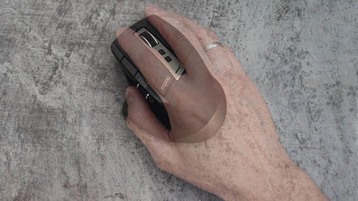 Rapoo MT750S очень удобно лежит в руке. Хват получается ладонным – кисть полностью ложится на мышь с максимальным пятном контакта с корпусом. Мне как пользователю с крупной ладонью (20 см) мышь показалась очень эргономичной. Редко на какую мышь удается положить ладонь полностью, а не удерживать исключительно пальцами.