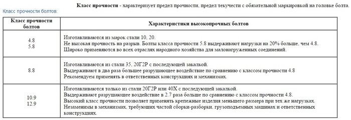 Те болты, которые вы берёте в строймаге - там обычно числа 4.8 и 5.8. И так же посчитав мы определим, что он 1,5...2 раза слабее чем выше указанные. Что же касается болтов 10,9 и 12,9 - их можно встретить на двигателях авто на ГБЦ.