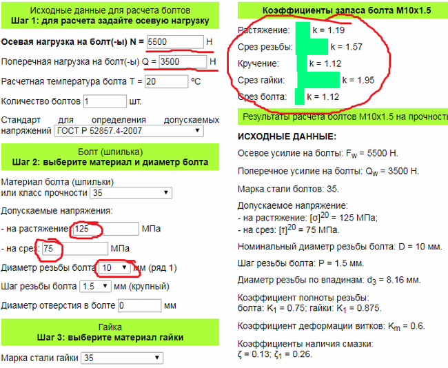 Для прикидочного расчёта болтов есть даже онлайн программы, где надо вписать все данные по болту. Что я собственно и сделал (но вообще для более точных расчётов нужно рассчитывать иначе).