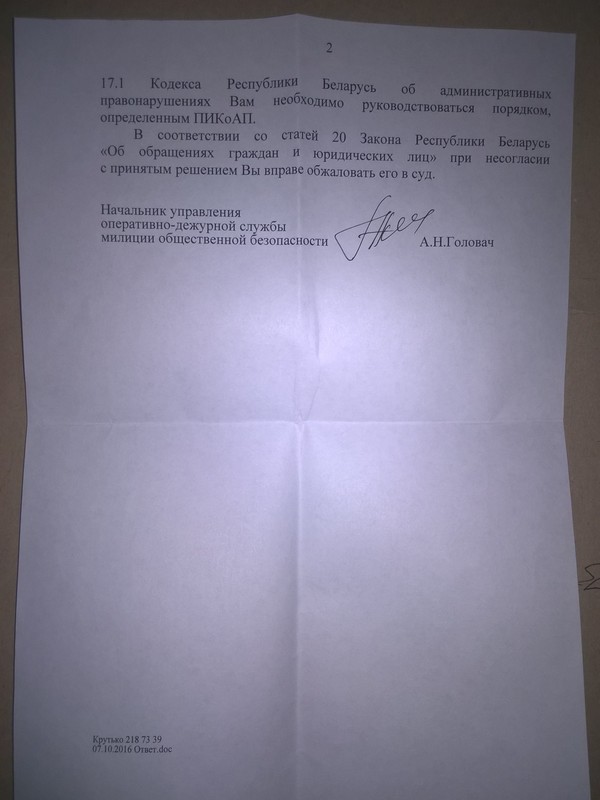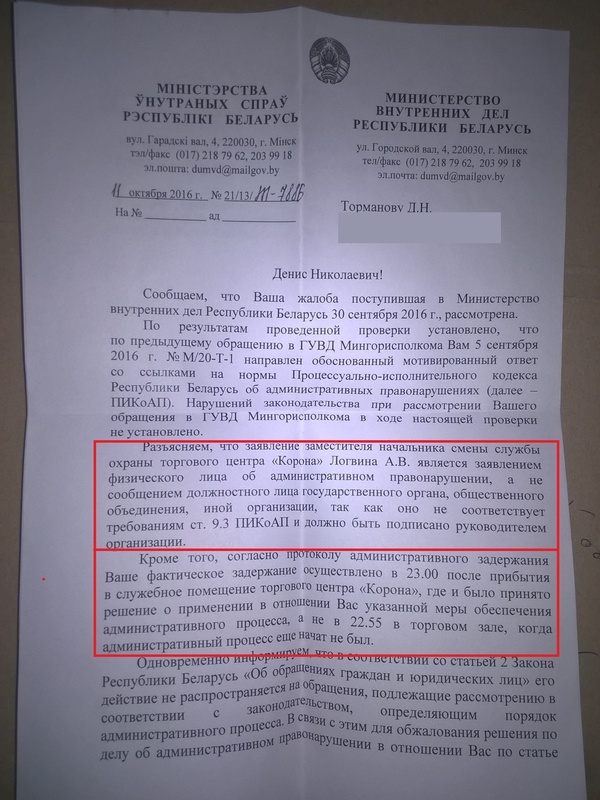 Тем не менее я написал жалобу в МВД.Ответ из министерства меня немного удивил. Мне разъяснили, что заявление заместителя начальника смены Логвина - это заявление просто физического лица, а не должностного лица, как это позиционировалось на суде. К чему тогда на нём печать короны и вся сопутствующая требуха?(скан этого заявления чуть ниже)